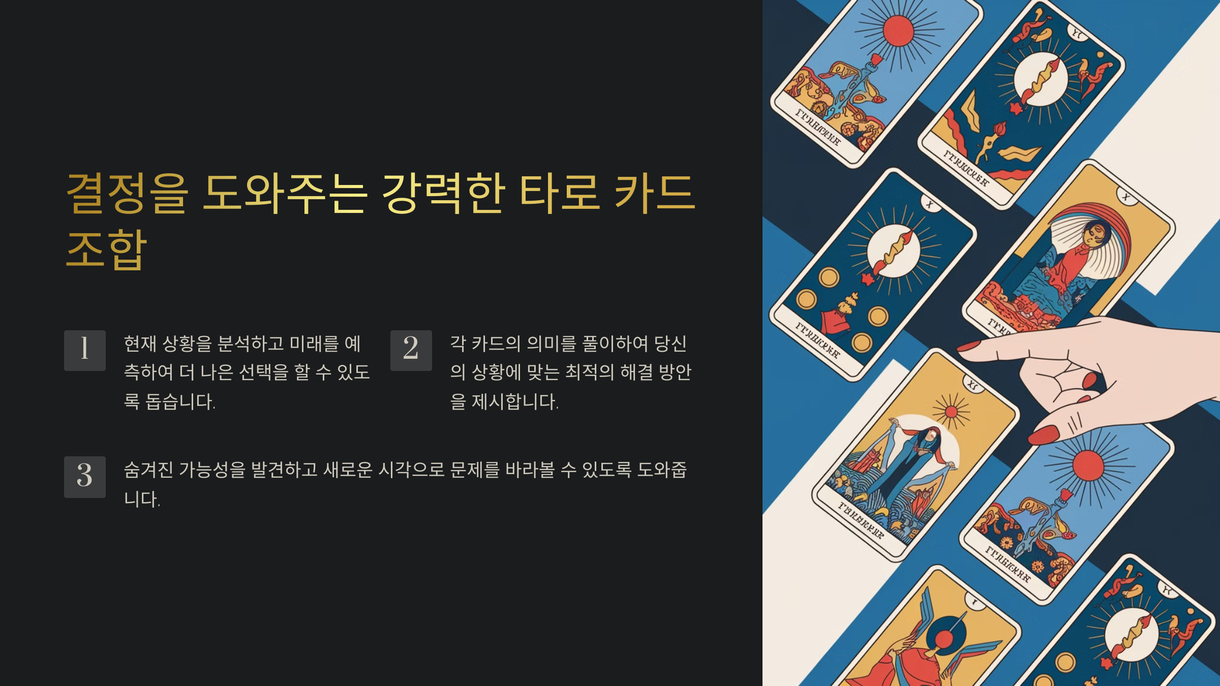 중요한 결정을 앞두고 있다면, 타로 카드 조합을 활용해 더 깊이 있는 통찰을 얻어보세요. 하지만 결국 선택과 행동은 여러분의 몫이에요!