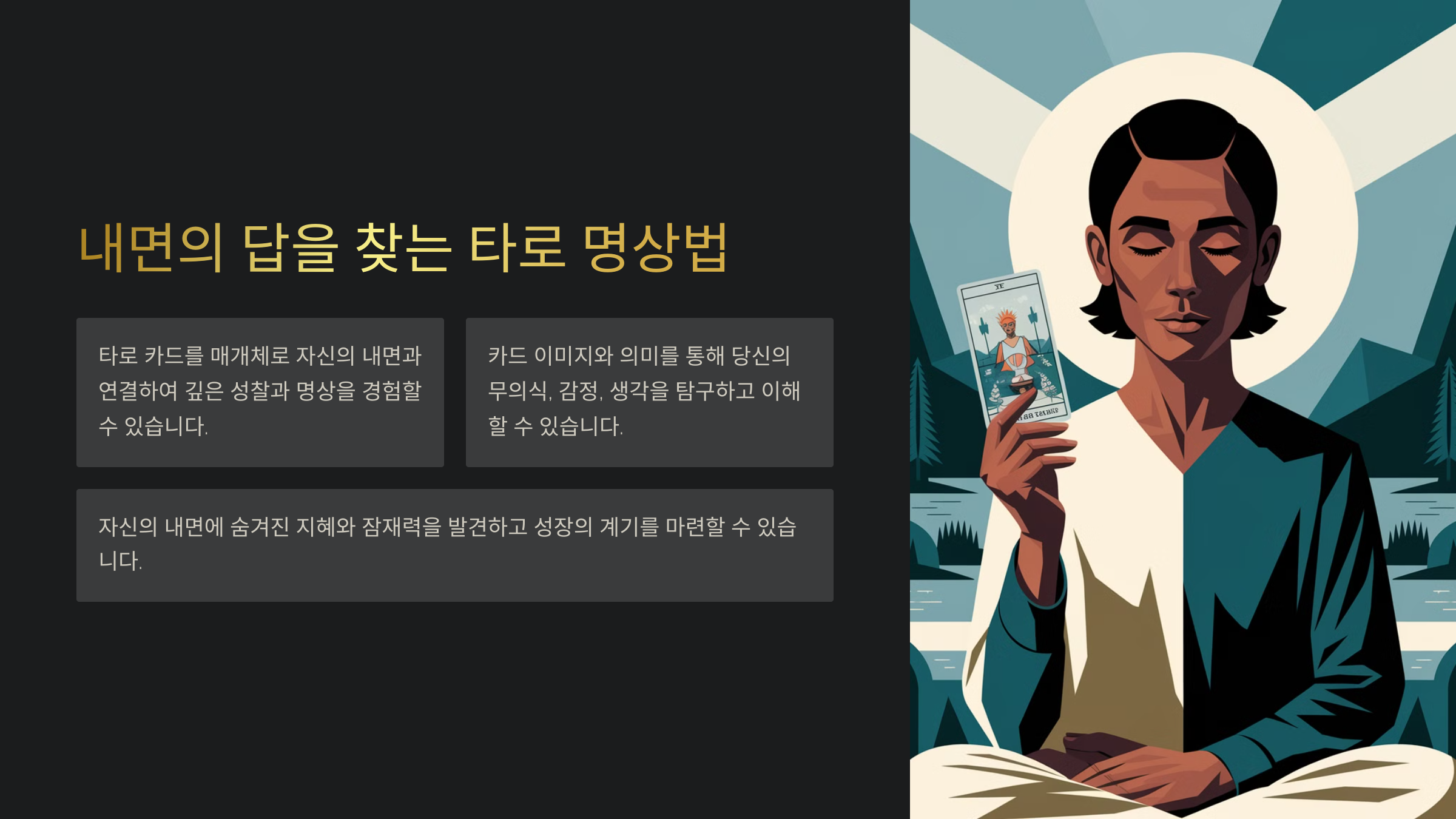 | 🌌 4. 카드와 마주하기 | 카드의 이미지, 색감, 상징을 천천히 바라보며 감정을 느껴보세요. |