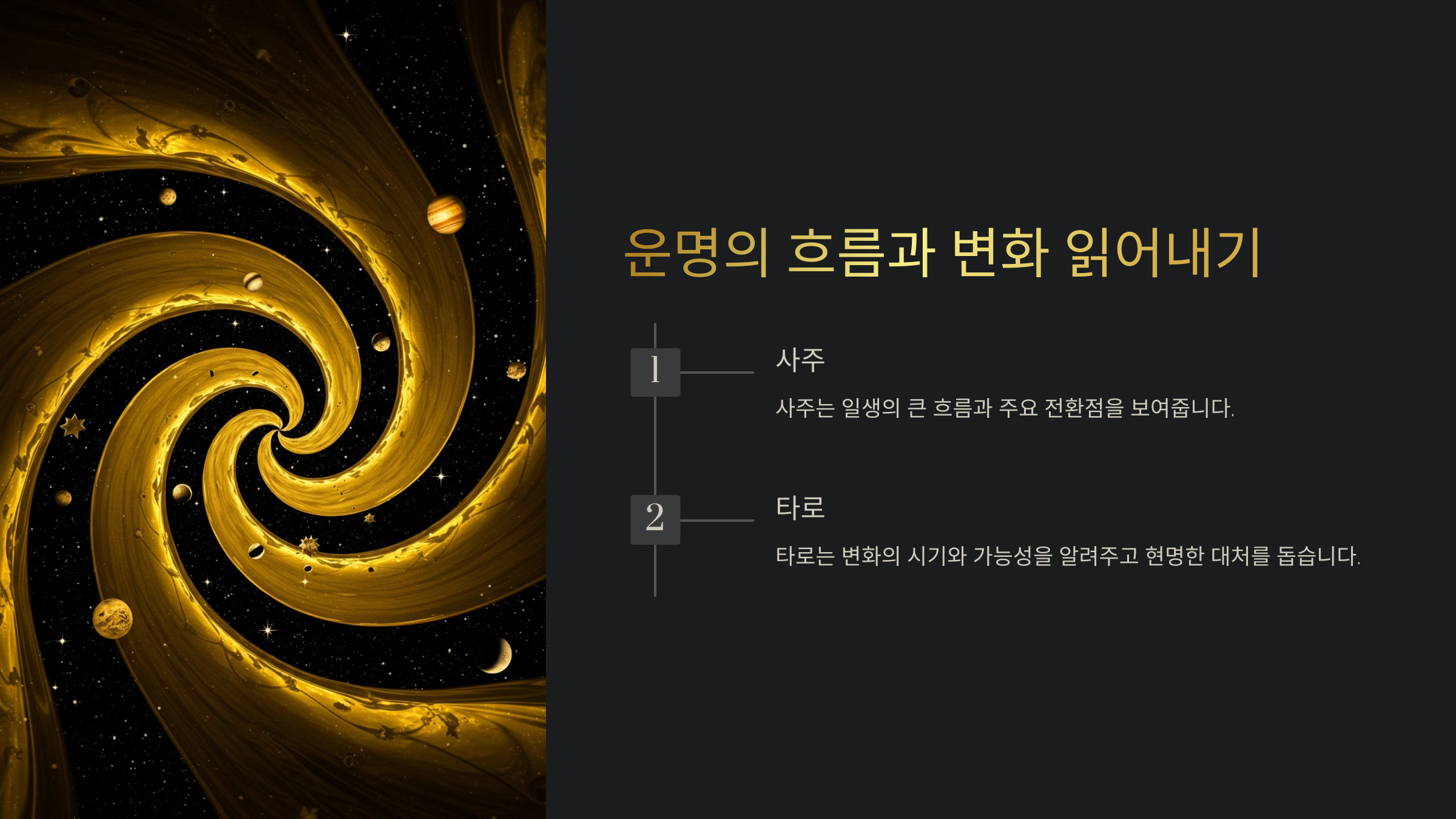 이 조합은 특히 중요한 결정을 앞두고 있을 때 도움이 돼요. 사주로 장기적인 계획을 세우고, 타로로 세부적인 전략을 구체화할 수 있어요. 이 과정에서 두 도구의 조화를 통해 현실적이면서도 직관적인 선택을 할 수 있답니다.
