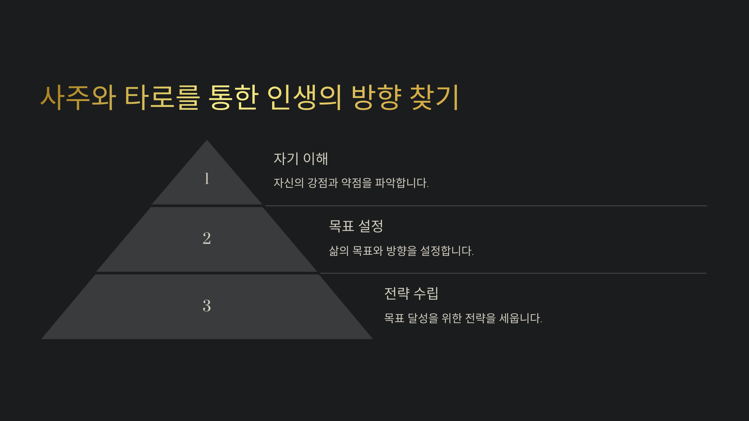 사주와 타로는 모두 자신을 이해하고 삶의 방향을 설정하는 데 강력한 도구예요. 사주는 당신의 천성과 운명적인 흐름을 알려줘 자신에게 가장 적합한 길을 찾도록 도와줘요. 예를 들어, 어떤 시기에 집중해야 할 분야나 잠재적인 도전과 기회를 알 수 있답니다.