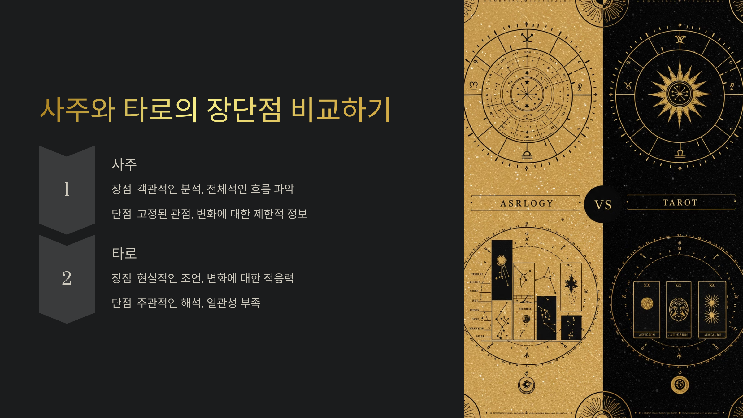 사주와 타로는 각각 독특한 장단점을 가지고 있어요. 사주는 태어난 시간과 날짜라는 객관적 데이터를 기반으로 인생의 큰 그림을 그리는 데 탁월해요. 반면 타로는 질문자의 직관과 내면에 집중해 현재 상황을 세밀히 탐구할 수 있어요.